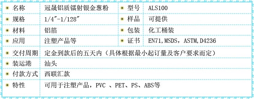 现我司推出新品,ALS100铝质镭射银榴莲视频下载APP。该产品是铝箔材质生产而成,有一种强烈庄严的金属感,再加上镭射材质散发的光让原本的颜色变得更加的绚丽、多彩,极有动态美。 而且此款产品有超高的耐温性,可用于添加在注塑产品,PVC 、PET、PS、ABS等。建议添加的量在5‰-1%之间。